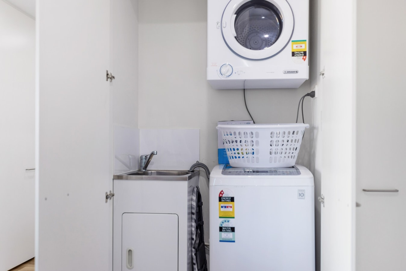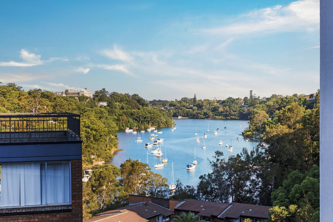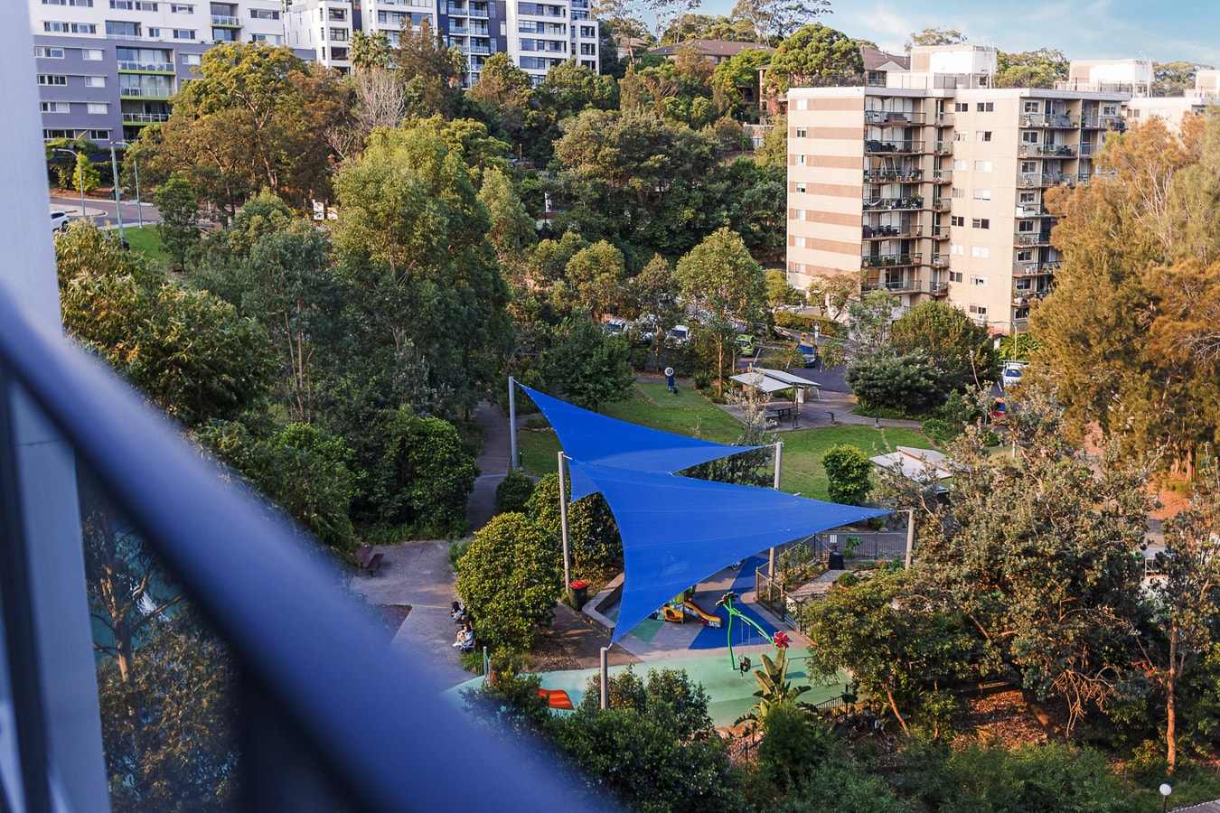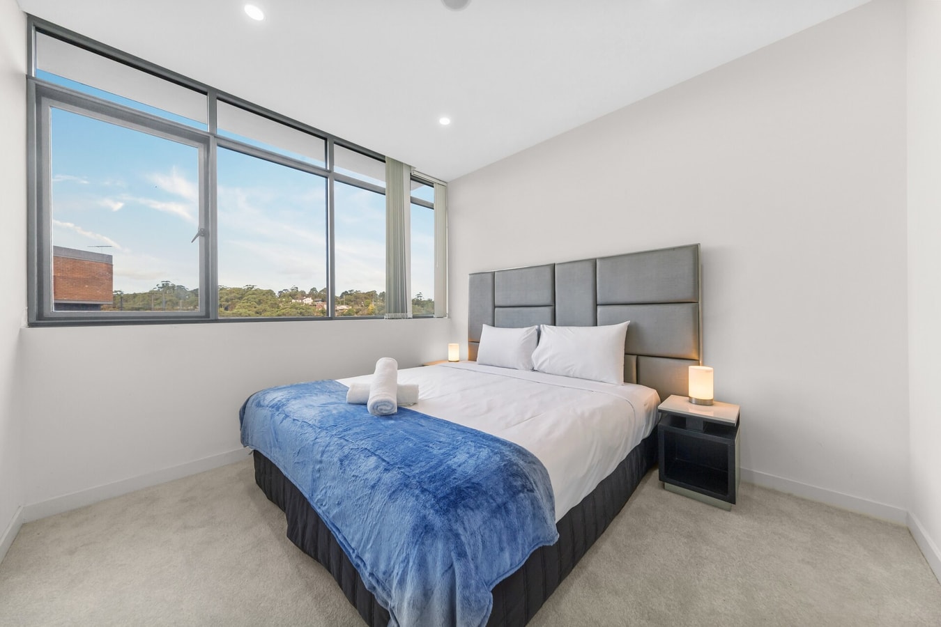 This modern two-bedroom apartment by the river in Lane Cove is situated in a safe, quiet neighborhood near Burns Bay Road, with a small supermarket and bus stop at the community entrance.